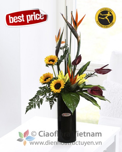 Based on feng-shui concept, this item is a perfect combination of red anthurium, yellow lilies and sunflowers, green leaves, and accented with birds of paradise on the top.