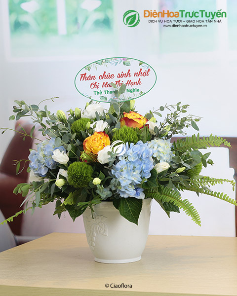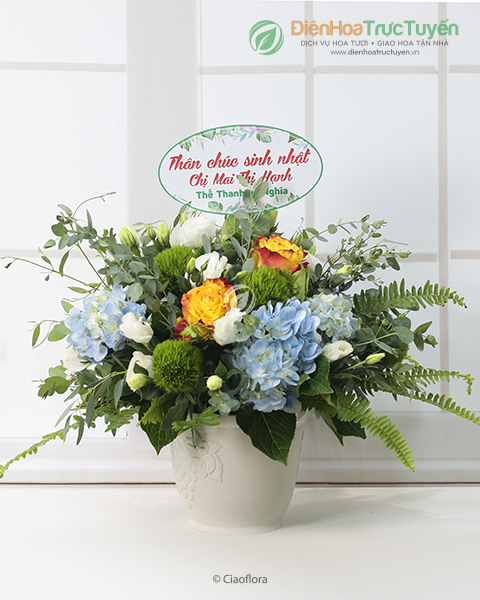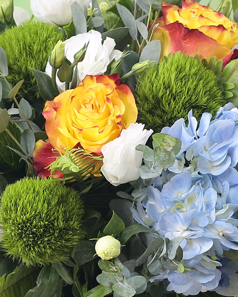 It's the timeless beauty and elegant simplicity of this arrangement that makes it special. A divine array of blue hydrangea, ecuador roses, green wicky are set in an ceramic vase to leave a lasting impression on its recipient. With each flower selected to complement the others, this arrangement makes a memorable gift for any occasion. Appr. H: 40cm, vase included.