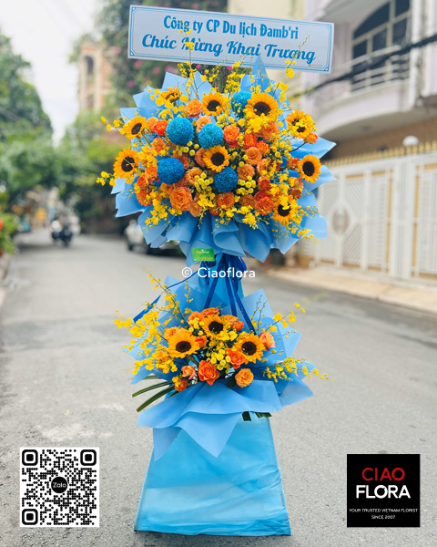 Send our Vibrant Victory Spray for any partners, customers on their events or anniversary. This exuberant arrangement bursts with the energy of sunflowers, symbolizing adoration and longevity, paired with the exotic allure of orchids and the classic beauty of roses. Wrapped in a striking blue decorative paper, this spray is a symphony of color that conveys excitement and congratulations. Perfect for grand opening ceremony, promotions, or any celebratory event, it's a splendid way to say "Congratulation" and "Here's to bright beginnings!"