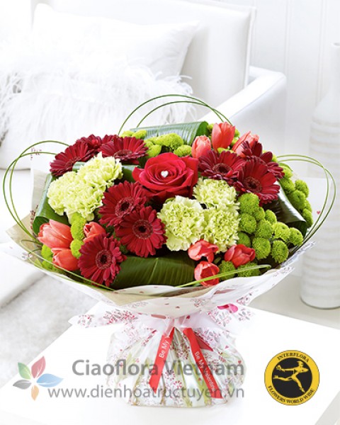 Show how much you care with this special hand-tied bouquet of radiant fresh flowers. We’ve chosen bright shades of lime green to contrast perfectly with the rich red and burgundy hues. This is a beautifully presented gift that is sure to delight your loved one.
