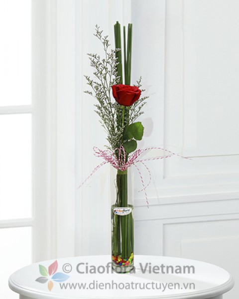 As innocent as that Only You, this elegant single long-stemmed red rose presented in a stylish glass vase is a definite statement.