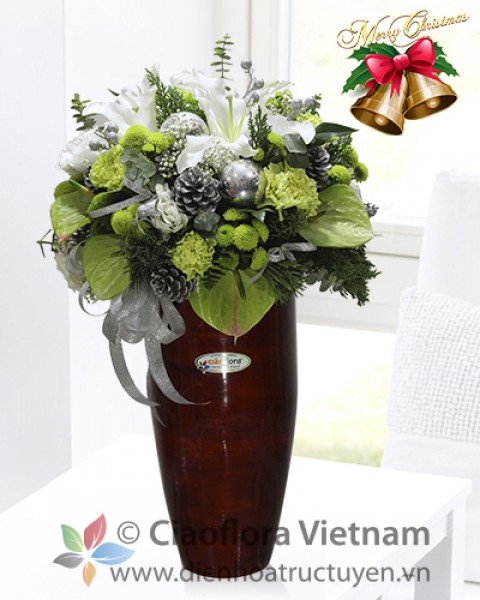 We’ve chosen white lilies and bloom carnation as snow white of this luxurious arrangement. We’ve added pine cones and fir plus glints of gold and silvery frost to create the extra-special feel to this gift.