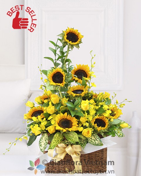 Sunshine basket is blooming with a bright cheer that will charm your friend or loved one at every turn. A selection of favourite flowers in vibrant yellow are combined by sunflowers, rose and dancer-orchid to create an arrangement guaranteed to convey your warmest wishes.
