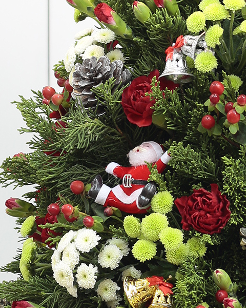 Carnation, Calimero, Hypericum and other fresh flowers, plus holly and evergreens, are arranged in the form of a Christmas tree and adorned with golden ornament balls, ribbon, gold-sprayed leaves and pinecones. Delivered in a ceramic vase.