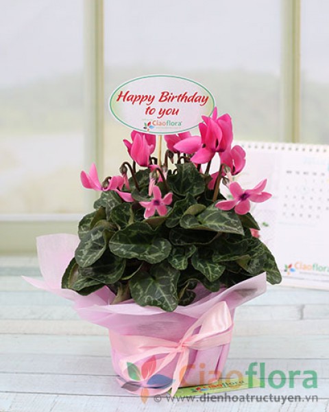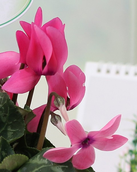 This seasonal delight of bright pink traditional cyclamen is presented in a light pink floral decorative paper.
