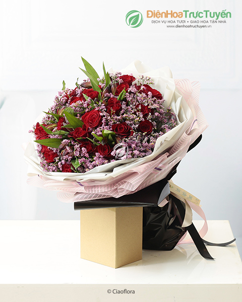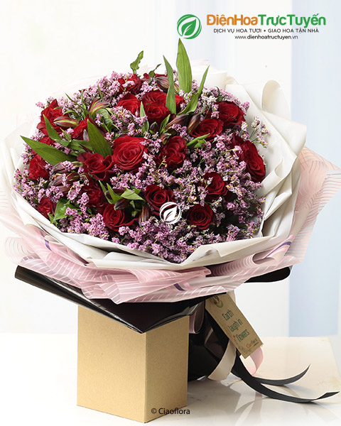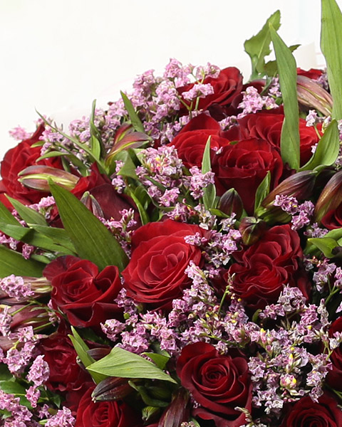 There is something so classically elegant about fresh red roses, carefully chosen, combine with exotic peruvian lilies. This is a perfect gift for love, or brighten up a birthday, anniversary or any days.