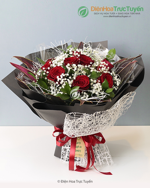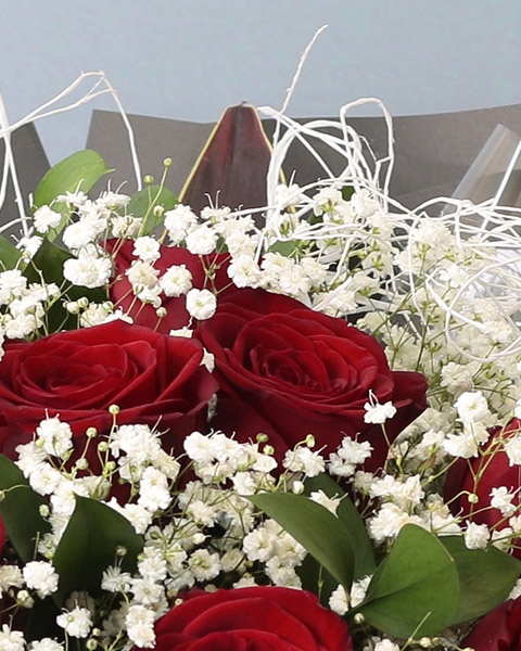 True love! Sweet love! Beautiful love! Celebrate all flavors of love with this classic romance bouquet of a dozen large headed red roses and baby breath.