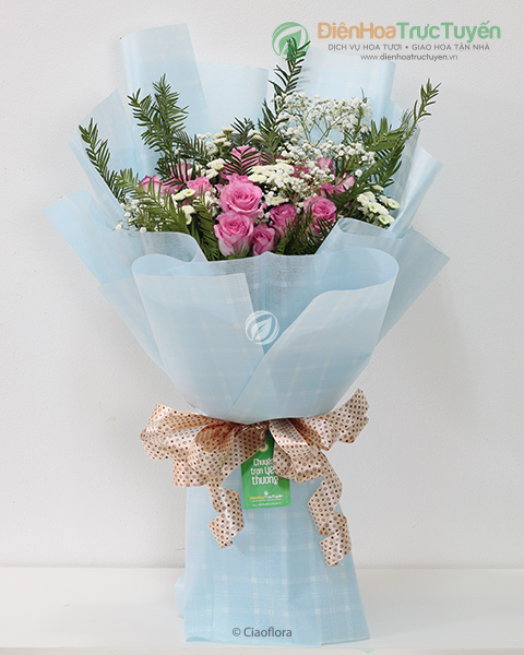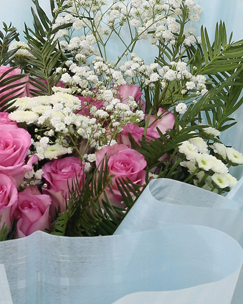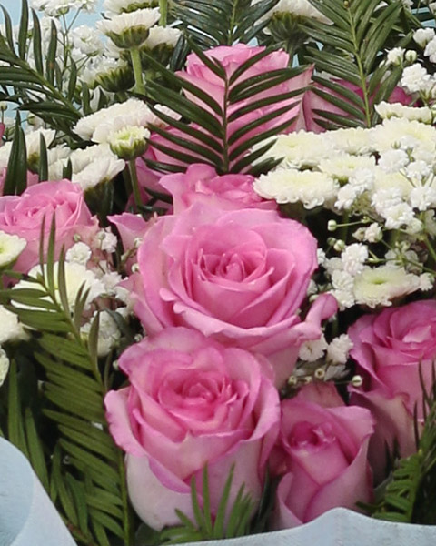 Tempt your loved one with this bouquet of pink roses, which is expertly nestled amongst lush green foliage and baby breath, perfectly wrapped and tied with delicate ribbon.