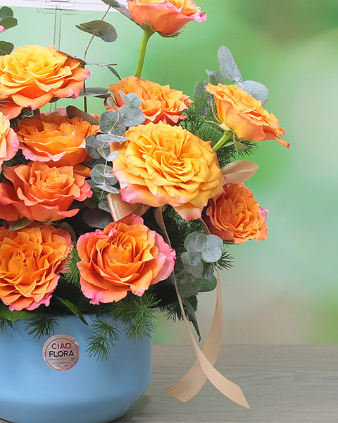 This is a stunning arrangement of 18 orange roses in a small cylinder ceramic vase. The vibrant orange color of the roses symbolizes enthusiasm, passion, and excitement. The compact size of the cylinder vase adds a touch of elegance and sophistication to the arrangement. The roses are carefully arranged to create a visually appealing display, with each rose perfectly placed to showcase its beauty.