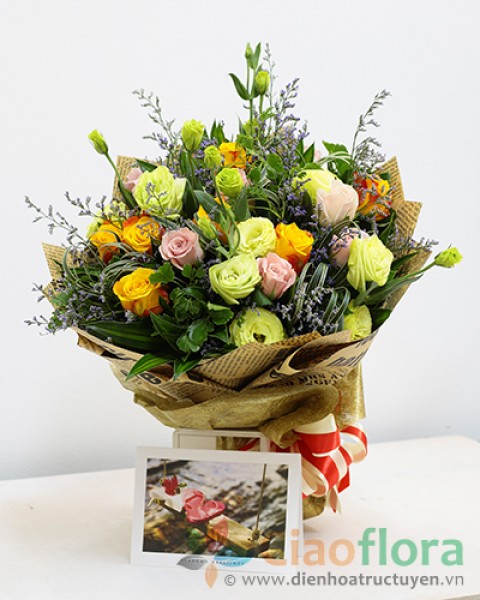 This wonderful looking combination of beautiful lisianthus, roses and purple limonium is exquisitely presented to create the perfect gift. Premium quality flowers in classic style are expertly hand-tied and finished with vintage paper wrap and tied with ribbon. This is a truly elegant gift - and a heartfelt gesture.