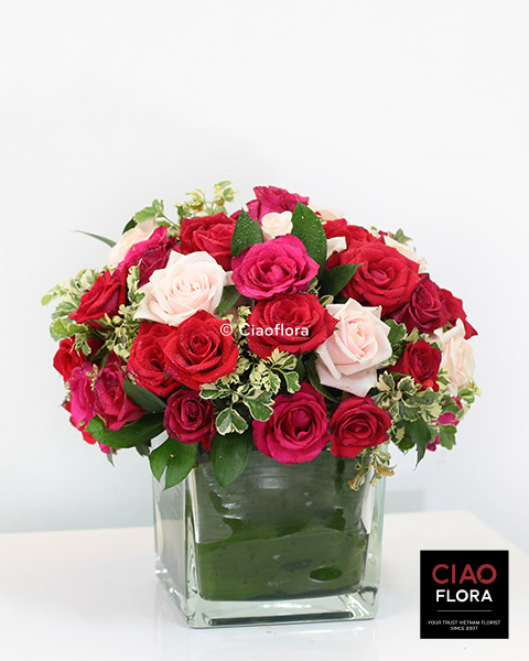 It's like receiving an armful of love. This beautifully billowing bouquet of lush red, pink and white roses in a glass cube vase is guaranteed to take her breath away. These beauties are delivered with fresh greens in a graceful glass vase, a timeless gift for your beloved