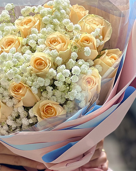 Bring beauty and peace to any occasion with this serenely elegant bouquet of roses and baby breath in a soothing classic style that shimmers in the light. Please note the bouquet pictured reflects our original design.