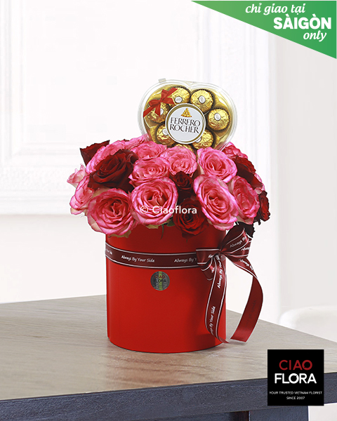 Our skilled florists have designed a stunning bouquet of rose flowers arranged and paired with a delicious Ferrero Rocher heart-shaped chocolate box for Valentine's Day.