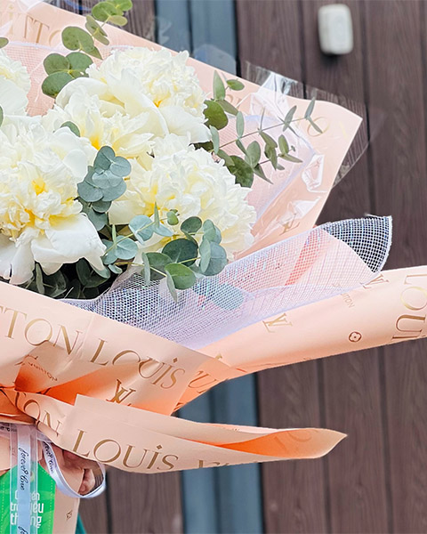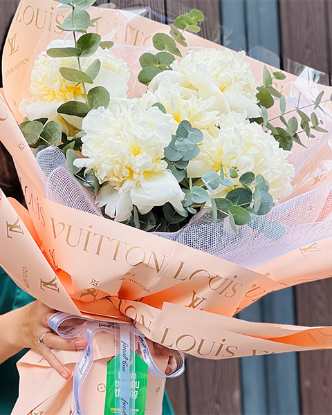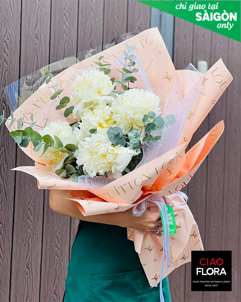 Whether you're seeking a romantic gesture, a heartfelt congratulations, or simply a way to brighten someone's day, this hand-tied bouquet of 5 white peonies is a stunning choice. Its elegant simplicity and timeless appeal are bound to leave a lasting impression and bring joy to anyone who receives it. Available in HCMC only.