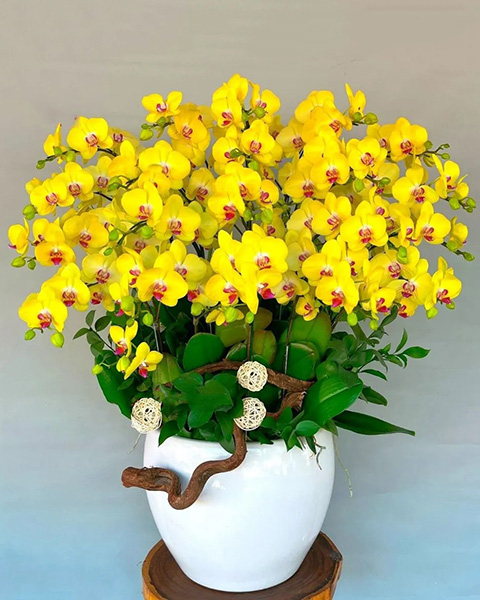 This vibrant display of 20 yellow Phalaenopsis orchids is a symbol of joy, optimism, and new beginnings. The bold yellow blooms stand out beautifully against the deep green leaves, creating a radiant and lively arrangement that brightens any space. Perfect for grand openings, congratulatory gifts, or celebrations, this arrangement exudes warmth and happiness.