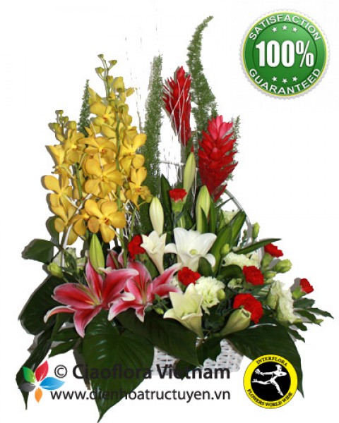 This mixed-cut flower basket, Success, is arrangered with monkara orchid, lilies, ginger flowers, lys and red carnation. A truly sophisticated gift for any occasion, such as congratulation, new position, birthday...