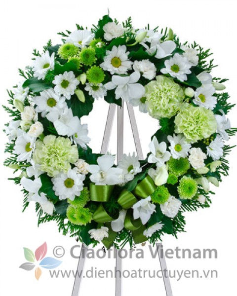 Cluster wreath of mixed flowers for a funeral service featuring white dendrobium orchids, green sims, geen button chrysanthemum, white chrysanthemum, white spray carnations and foliage.