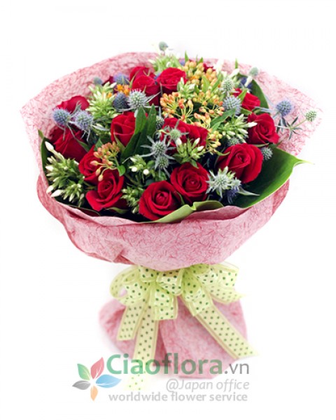 18 roses bouquet arranged with eryngium (or hypericum, baby's breaths)