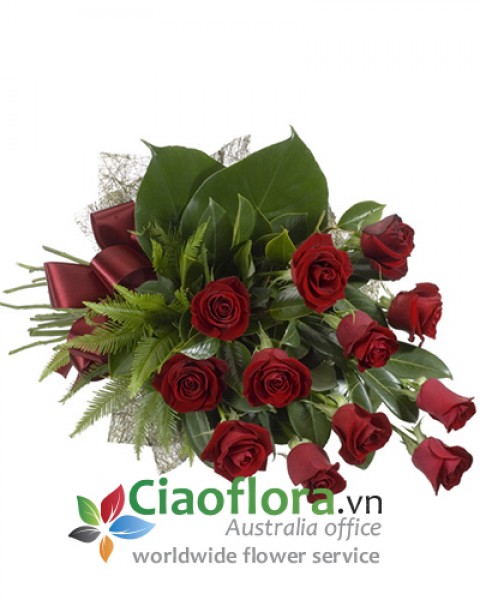 Sheaf style bouquet featuring 12 long red roses with lush greens.