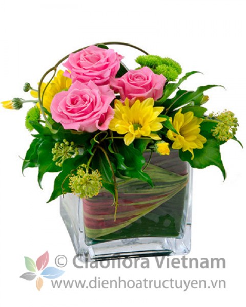 Mixed flower arrangement in a glass cube featuring pink roses, yellow daisy chrysanthemum and green button chrysanthemum.