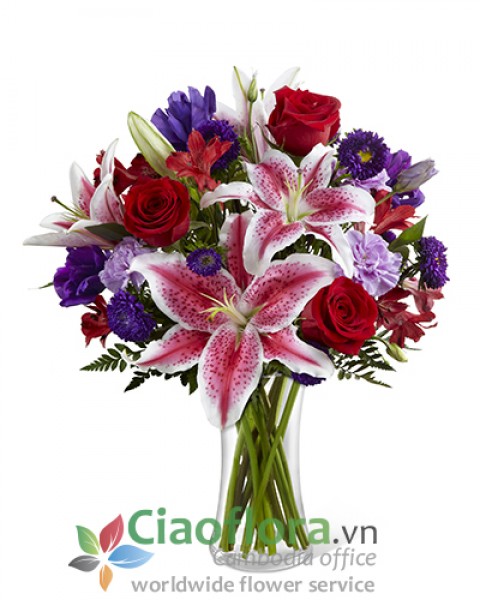 Wish them a Happy Anniversary with this elegant vased arrangement. This beautiful bouquet will surely catch their eye with its stunning array of red roses, pink lilies, purple iris, purple aster and more.