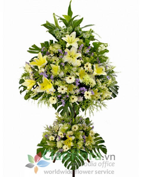 This flower stand are designed for funeral with yellow lilies, chrysanthemums and purple forget-me-not, decorated with other fresh flower and greens.