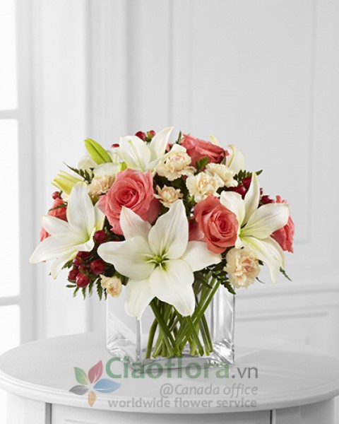 The Blushing Beauty Bouquet is a simply stunning bouquet of floral elegance and grace. Coral roses are set to capture their attention arranged amongst white Asiatic lilies, peach mini carnations, red hypericum berries and lush greens. Presented in a clear glass cubed vase, this bouquet creates a wonderful gift of blooming beauty.