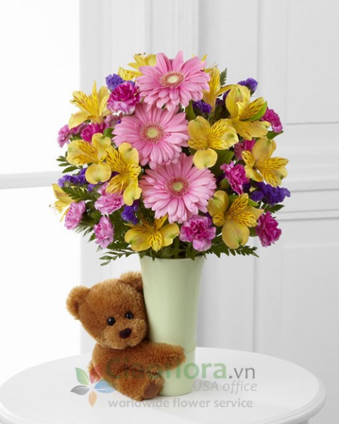 Pink gerbera daisies are surrounded by yellow Peruvian lilies, fuchsia mini carnations, purple statice and lush greens perfectly presented in a ceramic light green vase hugged by a darling brown plush bear to create an incredible gift for any occasion.
