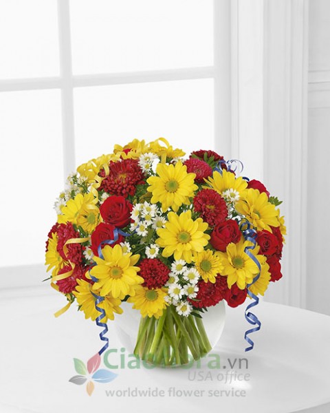 Happy Birthday! Its all for you! All your wishes for the best birthday ever are packed into this radiant bouquet. Bright red roses and Matsumoto asters contrast with sunny yellow daisies and white monte casino. Curling ribbon adds a festive finishing touch.