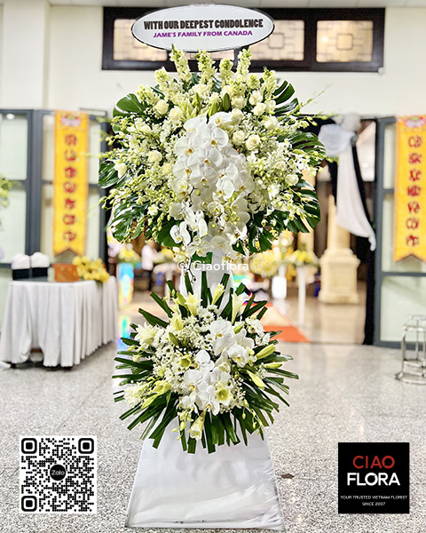 This luxury funeral spray is a profound expression of sympathy and reverence, designed to honor the memory of a loved one with grace and elegance. Featuring cascading white orchids, delicate roses, and lush greenery, the arrangement exudes a serene beauty that conveys peace and purity. The all-white color palette symbolizes eternal love and remembrance, making it a fitting tribute for any solemn occasion. This meticulously crafted spray not only serves as a heartfelt condolence but also brings a touch of dignity and sophistication to the funeral service. Ideal for those seeking to offer their deepest sympathies with a refined and timeless gesture.