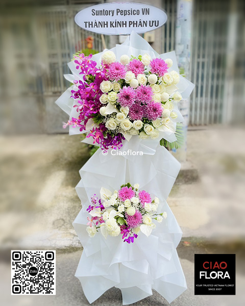 Embrace the serenity of remembrance with our elegantly crafted funeral wreath. Formed in a tender round shape, this heartfelt arrangement features pristine white Chrysanthemums and delicate orchids, symbolizing purity and eternal beauty. Each petal and bloom is carefully placed, creating a soothing visual tribute that expresses sympathy and love. As a gesture of condolence, this wreath serves as a graceful farewell, offering comfort and solace during difficult times. Honor the memory of your loved one with this dignified and timeless expression of compassion